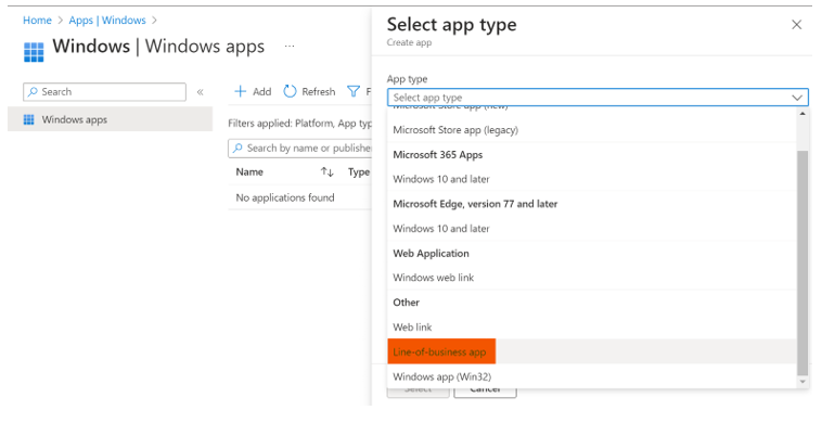 Access Intune at https://endpoint.microsoft.com and choose Apps -> Windows -> Add